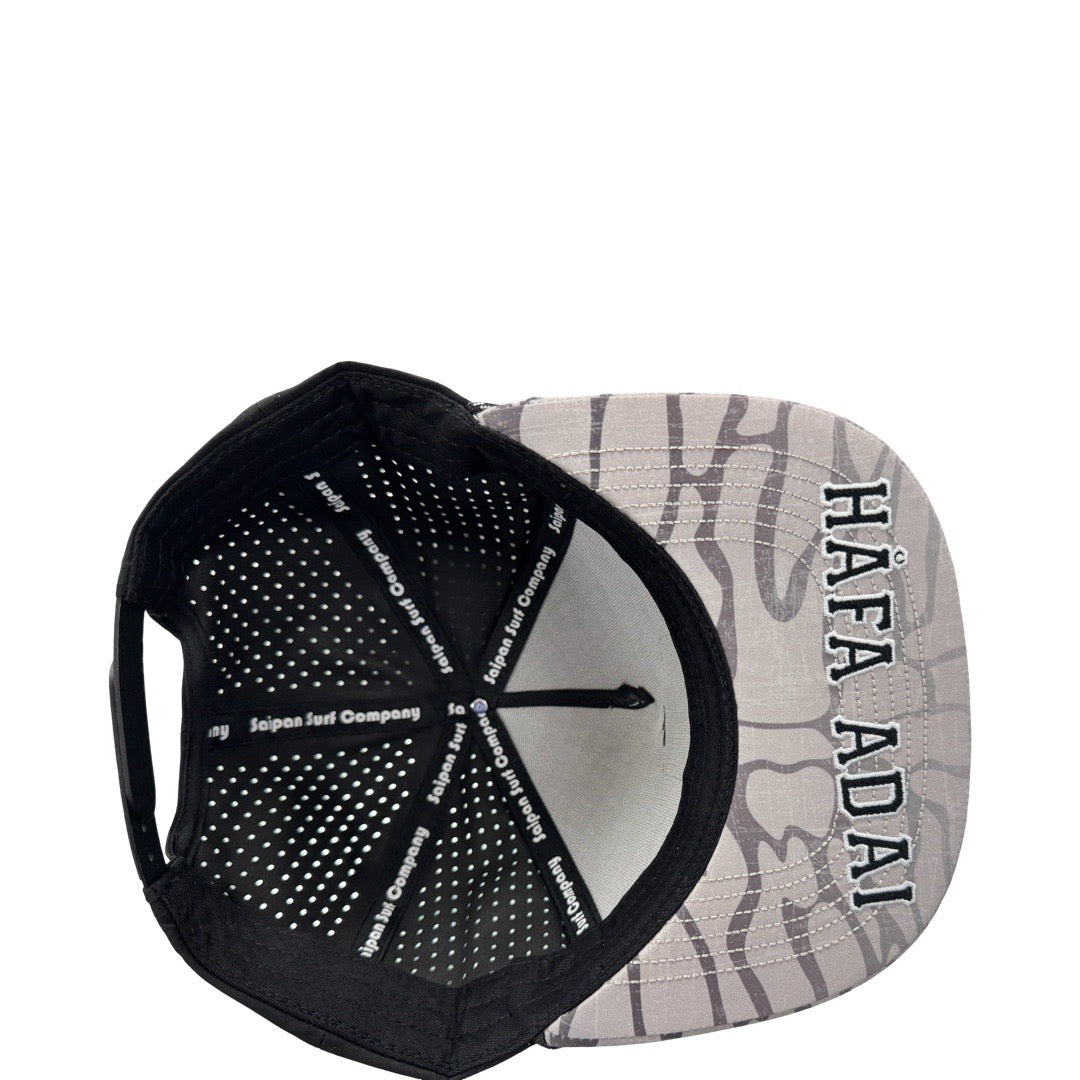 Waterproof material. Saipan Surf Co x Håga’ Tåsi rubber patch. Embroidered Håfa Adai under bill. 5 Panel Hat.
